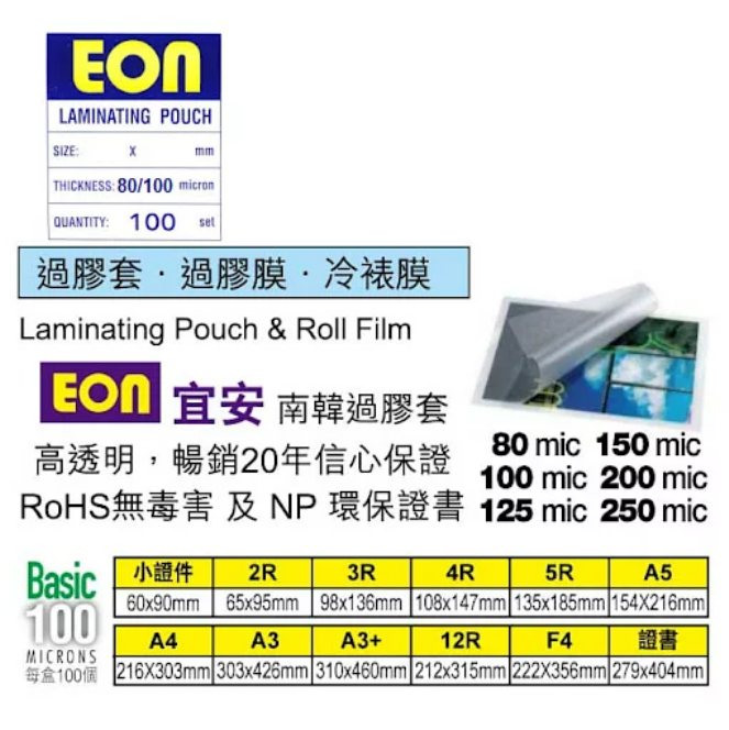 EON 宜安 相片尺寸 過膠片/過膠套 (100張)
