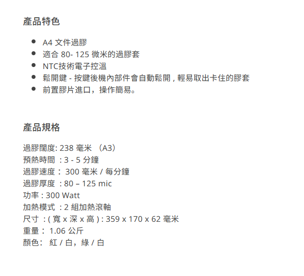 過膠闊度: 238 毫米 (A3)