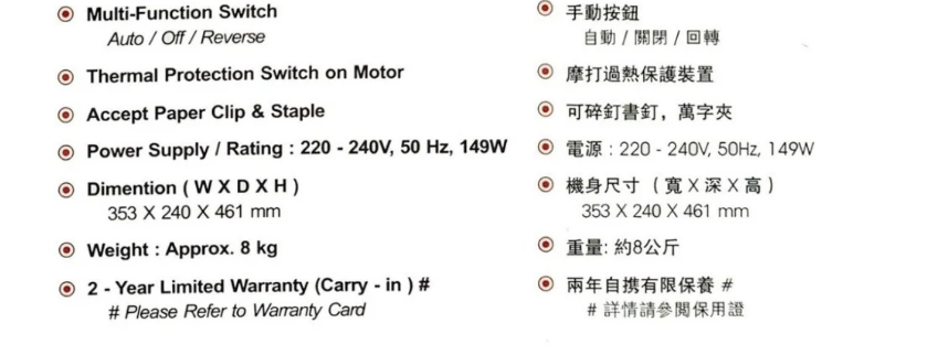 操作模式:自動開始/停止,回轉/移走紙屑桶自動熄機