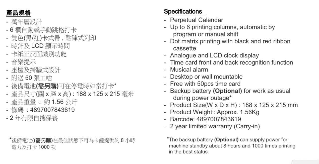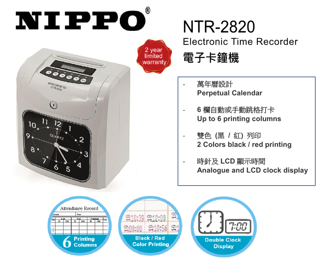 【貨品名稱】NIPPO NTR-2820 六欄位電子打卡鐘/打咭鐘