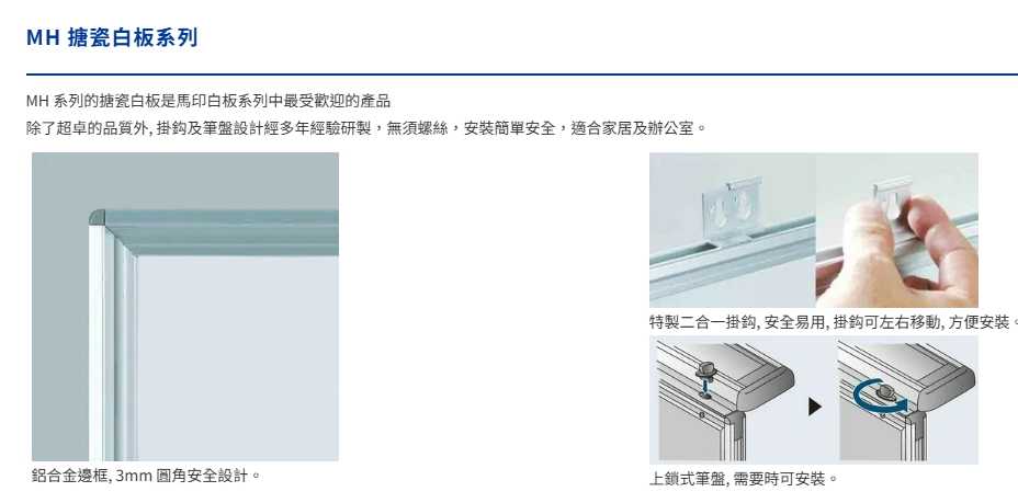 搪瓷板面,堅固、耐用抺刷不留痕跡,歷久常新超薄板面,厚度只有18mm 附有馬印牌白板刷一個及紅、黑白板筆各一支榮獲ISO9001品質保證 JIS 6007 日本工業規格認証板面保用5年 (不包括人為損壞) 機械壓制搪瓷板面,保證平滑,書寫順滑通過摩氐硬度測試,比其他白板硬度高出兩倍安裝簡易板身重量:14.1kg 日本製造